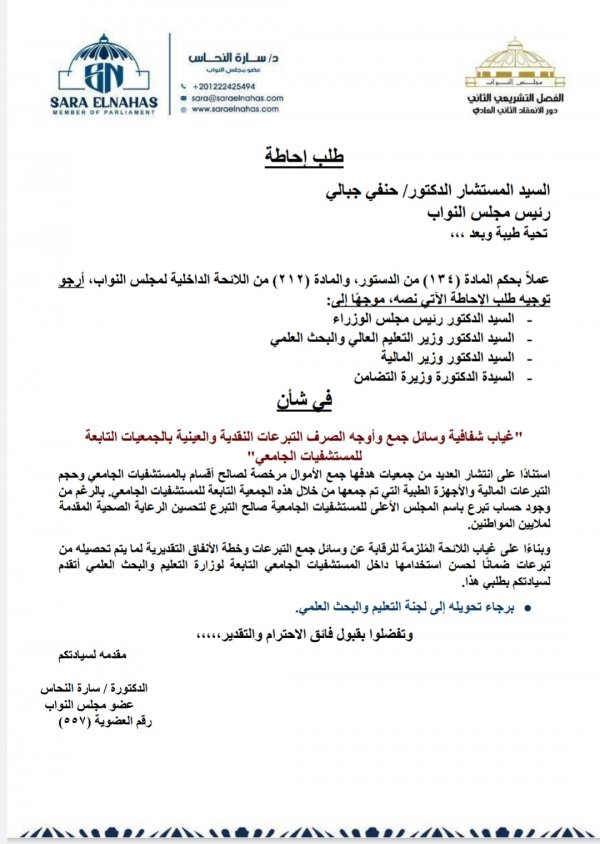 وذلك بشأن غياب شفافية وسائل جمع وأوجه الصرف التبرعات النقدية والعينية بالجمعيات التابعة للمستشفيات الجامعية، استنا ًدا على انتشار العديد من جمعيات هدفها جمع أموال مرخصة لصالح أقسام بالمستشفيات الجامعي وحجم