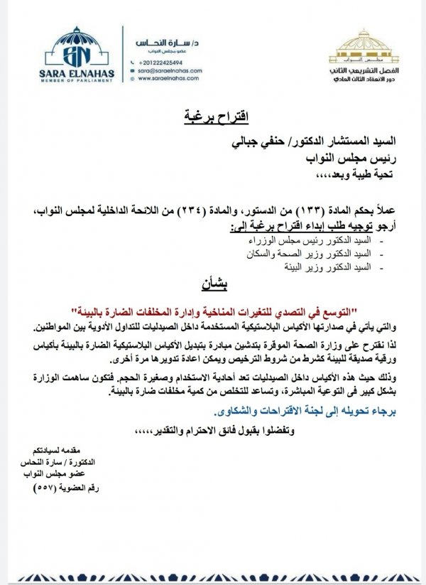 في ظل التوسع في التصدي للتغيرات المناخية وإدارة المخلفات الضارة بالبيئة والتي يأتي في صدارتها الأكياس البلاستيكية المستخدمة داخل الصيدليات للتداول الأدوية بين المواطنين، تتقدم النائبة سارة النحاس بمقترح لوزارة الصحة الموقرة بتدشين مبادرة بتبديل الأكياس البلاستيكية الضارة بالبيئة بأكياس ورقية صديقة للبيئة كشرط من شروط الترخيص ويمكن اعادة تدويرها مرة أخرى.