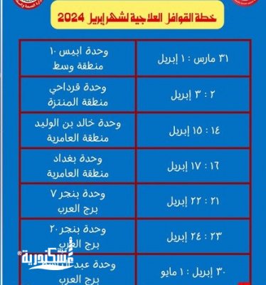 وفي هذا الصدد، تُنفذ مديرية الصحة بالإسكندرية برئاسة الدكتورة غادة ندا وكيل وزارة الصحة بالإسكندرية، وبالتعاون مع جميع الجهات المعنية ٧ قوافل طبية يتم تنفيذها خلال شهر أبريل وفقًا للمواعيد والأماكن التالية: حيث تقام يوم ( ١ أبريل) قافلة طبية بوحدة أبيس ١٠ بنطاق حي وسط