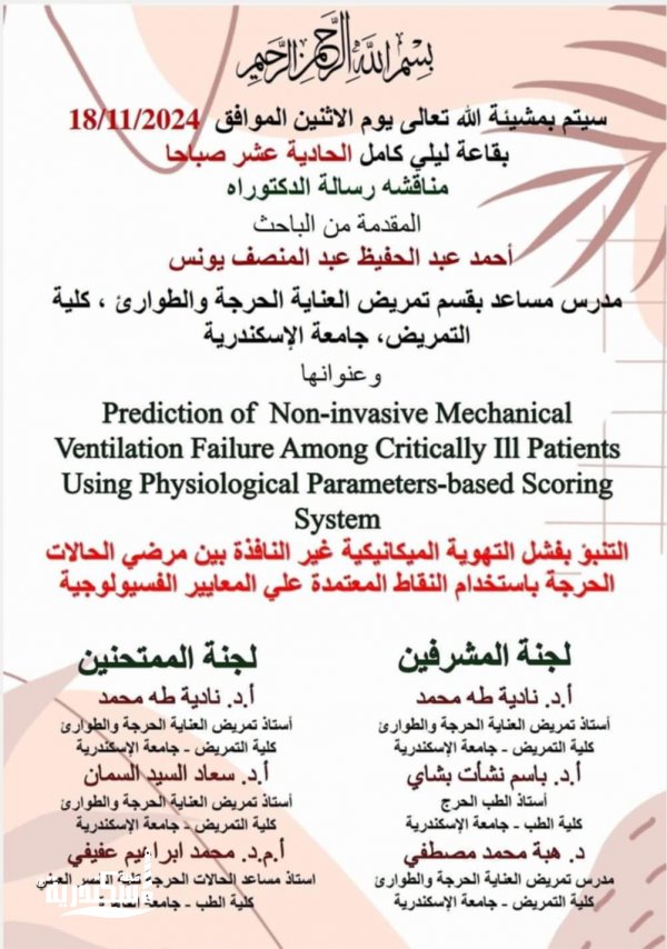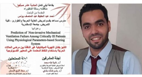 بـمـشـاعـر مليئـة بالفرحة والسرور تتقدم أسرة مجلة إسكندرية والأستاذ كريم حامد المدير التنفيذي للمجلة بـأحــر الـتهانـي والـتـبـريـكــات للدكتور أحمد عبدالحفيظ عبد المنصف يونس المدرس بقسم تمريض العناية الحرجة والطواريء بكلية التمريض جامعة الإسكندرية ، بمناسبة حصوله على شهادة الدكتوراه , راجين المولي له دوام الفرحه والسعادة والنجاح والتوفيق.
