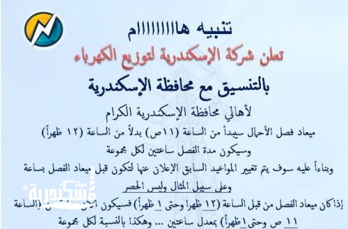وبحسب بيان شركة كهرباء الإسكندرية لأهالى محافظة الإسكندرية، فإن ميعاد فصل الأحمال سيبدأ من الساعة 11 صباحا بدلاً من الساعة 12 ظهراً، وسيكون مدة الفصل ساعتين لكل مجموعة.