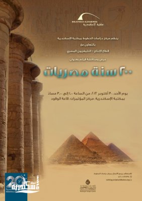 تقوم مكتبة الإسكندرية من خلال مركز دراسات الخطوط بعرض ومناقشة الفيلم الوثائقي "200 سنة مصريات" في إطار احتفال المكتبة بمرور 200 عام على فك رموز اللغة المصرية القديمة في عام 1822، وتأكيدًا على التعاون المثمر والبناء مع القناة الأولى بالتليفزيون المصري، وذلك يوم الأحد الموافق 30 أكتوبر في تمام الساعة الواحدة ظهرًا بقاعة الوفود بمركز المؤتمرات بمكتبة الإسكندرية.