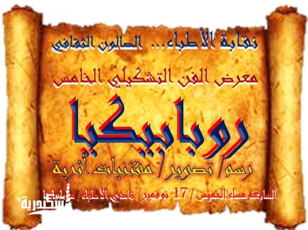 في إطار النشاط المجتمعي والإبداعي لنقابة الأطباء بالإسكندرية، سوف ينظم الصالون الثقافي لأطباء الإسكندرية المعرض الخامس للفن التشكيلي (الرسم والتصوير الضوئي والمقتنيات الأثرية ) تحت عنوان ( روبابيكيا) يوم الخميس القادم الموافق
