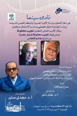 بمناسبة الإحتفال بذكري "أبو الرواية العربية" الأديب العالمي نجيب محفوظ، تنظم دار الأوبرا المصرية برئاسة الدكتور مجدي صابر بالتعاون مع المركز القومى للسينما برئاسة المونتيرة منار حسني حفل نادي سينما أوبرا الإسكندرية بالموسم الفني الخامس له وذلك في تمام السابعة من مساء غدا الجمعة الموافق ٣٠من ديسمبر على مسرح دار أوبرا الاسكندرية، حيث يتم عرض فيلم" نجيب محفوظ ضمير عصره"من إخراج هاشم النحاس. يعقبه ندوة فنية يديرها الناقد السينمائي أحمد النبوي بحضور الناقد السينمائي سامي حلمي،والأديب والروائي/مصطفي نصر. يشار إلى أن الاديب الراحل نجيب محفوظ صدر له ما يقارب الخمسين مؤلفا من الروايات والمجموعات القصصية وقد حصل على جائزة نوبل للآداب عام ١٩٨٨ وهو أول أديب عربي يحصل على هذه الجائزة العالمية، كما ترجمت الكثير من أعماله الأدبية إلى لغات متعددة وسجلت في أرقى المكتبات العالمية باعتباره أحد الكتاب البارزين في العالم. يذكر الى أنه تم ادراج نادى سينما اوبرا الاسكندرية ضمن برنامج أنشطة دار الاوبرا المصرية خلال الموسم الفنى لعامى ٢٠١٨..٢٠١٩ بهدف تعزيز القيم الايجابية من خلال الافلام التى تعبر عن الواقع وتساهم فى بناء وتكوين الشخصية وتحافظ على الهوية. .وان الاقبال الجماهيرى خلال عروض نادى السينما خلال المواسم الفنية السابقة وخاصة من الشباب يرسخ دور الثقافة فى استثمار الطاقات البشرية لنشر الوعى فى المجتمع.