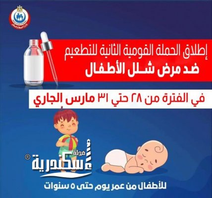 أعلن الدكتور/ سعيد السقعان، وكيل- وزارة الصحة بالإسكندرية، عن اطلاق الحملة القومية الثانية للتطعيم ضد مرض شلل الأطفال بالمجان بمحافظة الإسكندرية وذلك خلال الفترة من يوم 28 حتى 31 مارس الجارى ،ضمن الحملة القومية للتطعيم ضد هذا المرض التي تنظمها وزارة الصحة والسكان على مستوى الجمهورية وتستمر لمدة أربعة أيام، وتستهدف الأطفال المصريين وغير المصريين من عمر يوم وحتى عمر 5 سنوات بهدف الحفاظ على مصر خالية من مرض شلل الأطفال.