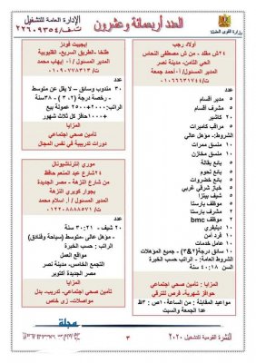 أعلن محمد سعفان، وزير القوى العاملة، عودة نشرة التوظيف الشهرية التي تصدرها الوزارة بعد أن توقفت 4 أشهر بسبب جائحة فيروس كورونا المستجد، بفرص عمل تصل إلي 7599 للذكور والإناث في جميع التخصصات والقطاعات الوظيفية المختلفة برواتب تصل إلي 6500 جنيه في بعض المهن، وطبقا لخبرة المتقدم ، فضلا عن التأمين الصحي والاجتماعي وبوليصة تأمين ضد الحوادث، ومواصلات وسكن للمغتربين، ووجبة غذاء في بعض الشركات، وذلك من خلال 20 شركة ومصنع خاص في جميع المحافظات من الآن حتى نهاية سبتمبر المقبل . وقال محمد سعفان، في تصريحات صحفية، اليوم ، إن نشرة التوظيف تتضمن هذه الفرص والتي يأتي تنفيذًا لمبادرة "حياة كريمة"، التي أطلقها الرئيس عبد الفتاح السيسي مطلع عام 2019، لرعاية الفئات الأكثر احتياجًا وتوفير حياة كريمة لهم، وعمل لائق، لافتًا إلى أن النشرة تهدف إلى عرض جميع الوظائف المتاحة فى القطاع الخاص ويتم التقديم علي الموقع الالكتروني "برنامج طالبي العمل" www.manpower.gov.eg تحت مسمى "النشرة القومية للتشغيل"، وسوف تقوم الإدارة المختصة بترشيح المتقدمين على الفرص وفقا لخبراتهم المسجلة بالبرنامج بتوفير فرص مناسبة للمتقدم لاستغلال طاقات الشباب فيما يفيد المجتمع. وأضاف الوزير أن العمل مهم لرفع اقتصاد الدولة، والدفع بعجلة التنمية للأمام، وتابع: "نحن نسعى من خلال توفير فرص العمل للشباب بالقطاع الخاص إلى إكساب الشباب العديد من الخبرات المجتمعية التى تساعدهم فى الارتقاء إلى ما يتمنون تحقيقه فى مستقبلهم". وكشف وزير القوى العاملة عن أن فرص العمل المتوفرة تشمل: 300 سائق رخصة خاصة مهنية ، و100 ضابط أمن ، و 3000 فرد أمن مؤهل عالي ومتوسط ، و 3000 عامل نظافة مؤهل إعدادية ، و250 فني صيانة تبريد وتكييف وكهرباء وسباكة ومصاعد مؤهل وبدون، والسن من 18 إلى 40 سنة ذكور وإناث، و26 يوم عمل و4 أيام راحة أسبوعية داخل القاهرة ، و24 يوم عمل وراحة 6 أيام خارج القاهرة . كما تشمل الفرص محاسبين تكاليف، ومدير موارد بشرية، وأمن ، وفني لحام ودوكو وبرادة وفيبر ، ومشرف أقسام، وكاشير، ومراقب كاميرات، ومنسق ممرات، ومخازن، وبقالة، ولحوم، وخضروات، وخباز شرقي غربي، ويليفري، وعامل خدمات، ومندوبين، وسائقين، وشيف، ومسئول ائتمان ، ومراقب أمن صناعي، ومراقب أمين إداري، وأمني مخزن ، وفني كهرباء وصيانة ثلاجة، وميكانيكي معدات زراعية، وجرارات، ومكابس وفني كاوتش وكهربائي معدات . وموضح بالصورة تفاصيل فرص العمل بأسماء الشركات والعناوين والتليفونات وشروط شغل الوظيفة والمرتب .