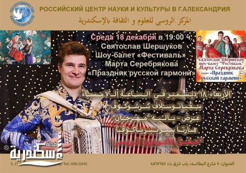 ينظم المركز الروسي للعلوم والثقافة بالاسكندرية برئاسة القنصل الروسي مراد جاتين غدا " الاربعاء " حفلا فنيا روسيا ياتي متزامنا مع بدء انطلاق العام الثقافي المصري الروسي 2020 .