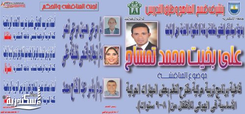 ناقشت قسم المناهج وطرق التدريس كلية التربية الرياضية جامعة الإسكندرية، رسالة دكتوراه عن فاعلية برنامج تربية حركية مقترح لتعلم بعض المهارات الحركية الأساسية فى الهوكى للاطفال من ٨- ٩ سنوات، والمُقدَّمة من الباحث على بخيت محمد تمساح. ترأس لجنة المناقشة الدكتور مرعى حسين مرعى نصر، أستاذ تدريب الهوكي بقسم تدريب الألعاب الرياضية كلية التربية الرياضية بنين جامعة الإسكندرية، والدكتورة نجلاء فتحى خليفة على، أستاذ طارق تدريس التمرينات والعروض الرياضية بقسم المناهج وطرق التدريس بكلية التربية الرياضية للبنات جامعة الإسكندرية، والدكتور ياسر عبد الفتاح محمد، أستاذ مساعد بقسم المناهج وطرق التدريس التربية الرياضية بكلية التربية الرياضية جامعة المنصورة.
