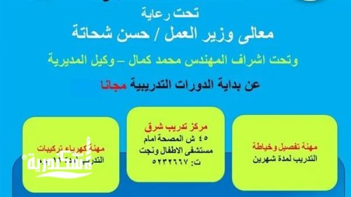 أعلنت مديرية العمل بمحافظة الإسكندرية عن بدء قبول طلبات التدريب المهنى المجانى على مهنتي الخياطة والتفصيل ، وكهرباء التركيبات ، بمركز تدريب مهني شرق التابع للمديرية ، وذلك للشباب من الجنسين من حملة المؤهلات العليا والمتوسطة وبدون مؤهل من سن 18 إلى 45 سنة ، وتنفيذاً لتوجيهات وزير العمل حسن شحاتة بالاهتمام بالشباب من الجنسين وتوفير برامج تدريبية مستحدثة لهم وفق أحدث الأساليب العالمية تتماشى مع متغيرات ومتطلبات سوق العمل لتأهيلهم للحصول على فرص عمل لائقة وحقيقية داخل منشآت القطاع الخاص .