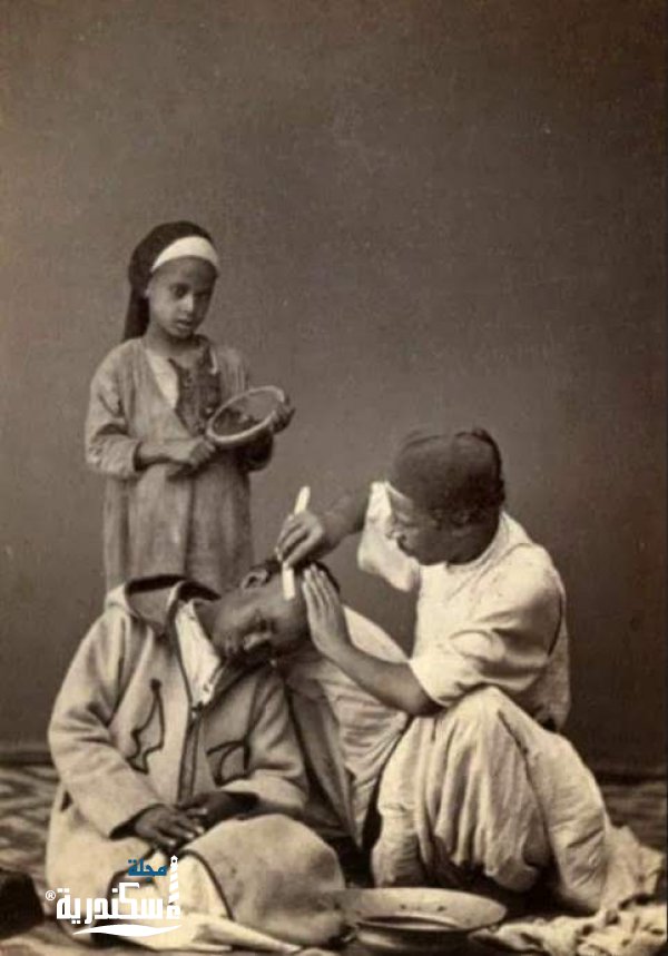 عدة الحلاق (موس /إناء صغير/طاسة /مسن للمرس /وبعض قطع القماش"وصابون لغسل الرأس به قبل الخلاقة)