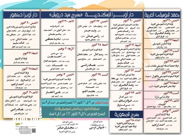 يذكر ان فعاليات الدورة 31 من مهرجان ومؤتمر الموسيقى العربية يتواصل لمدة 15 يوما متتالية فى الفترة من 20 أكتوبرحتى 3 نوفمبر المقبل ويضم 39 حفل غنائى وموسيقى بمشاركة 99 فنان من 9 دول عربية هى مصر ، المغرب ، الأردن ، لبنان ، سوريا ، العراق ، البحرين ، السعودية ، تونس ، ويقام على مسارح الاوبرا المختلفة بالقاهرة ( النافورة ، الصغير ، معهد الموسيقى العربية ، الجمهورية ) ، مسرح سيد درويش ( اوبرا الاسكندرية ) واوبرا دمنهور هذا الى جانب المؤتمر العلمى الذى يعقد في الفترة من 22 إلى 26 أكتوبر ويناقش موضوع المسرح الغنائي علامات فارقة في مسيرة الموسيقى العربية من خلال 7 محاور هى نشأة المسرح الغنائي العربي وازدهاره ، رواد التلحين والأداء فى المسرح الغنائي المصرى ، رواد المسرح الغنائي المصري منذ منتصف القرن العشرين وحتى الآن ، التجارب الإبداعية للمسرح الغنائي فى البلاد العربية ، المسرح الغنائي العربي بين المعالجة الدرامية والرؤية الموسيقية ، تجارب مستحدثة فى المسرح الغنائي العربي ، قضايا جمع وتوثيق وإحياء المسرح الغنائي العربي ، بالاضافة الى المسابقة الفنية التى تحمل اسم الدكتورة رتيبة الحفنى في الغناء للشباب والاطفال وذوى القدرات الخاصة والتميز للهواه في العزف المنفرد على جميع الآلآت الموسيقية ، الى جانب معرضا لفنون الخط العربى للفنان المكرم محمد يوسف عبد اللطيف المغربي بقاعة صلاح طاهر.