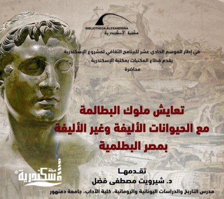 تنظم مكتبة الإسكندرية، في إطار فعاليات الموسم الحادي عشر للبرنامج الثقافي لمشروع الإسكندرية بقطاع المكتبات محاضرة بعنوان «أساليب التعايش مع الحيوانات الأليفة وغير الأليفة في مصر البطلمية» تلقيها د. شيرويت مصطفى فضل؛ مدرس التاريخ والدراسات اليونانية والرومانية، كلية الآداب، جامعة دمنهور.