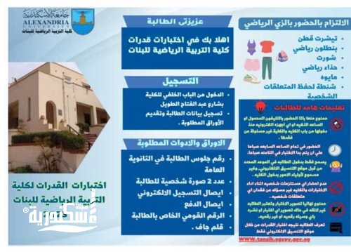 تواصل كلية التربية الرياضية بنات في جامعة الإسكندرية اختبارات القدرات للطالبات من خريجات الثانوية العامة، الراغبات في الالتحاق بالكلية للعام الجامعى 2023 /2024، ضمن الكليات التي يشترط القبول بها اجتياز اختبارات القدرات.